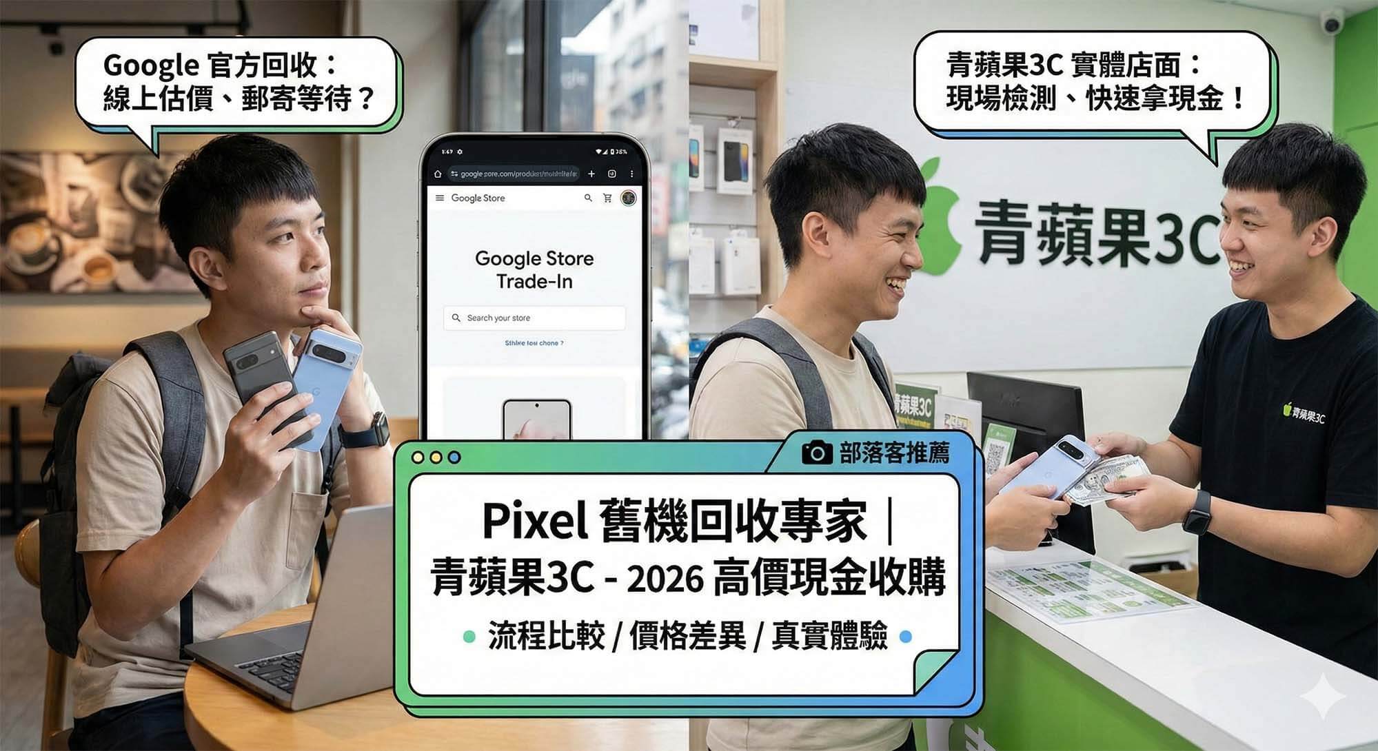 青蘋果3C 收購 Pixel 舊機回收服務,展示 Google 手機與現金交易 / Green Apple 3C Pixel old phone recycling service, showing Google phone and cash transaction.